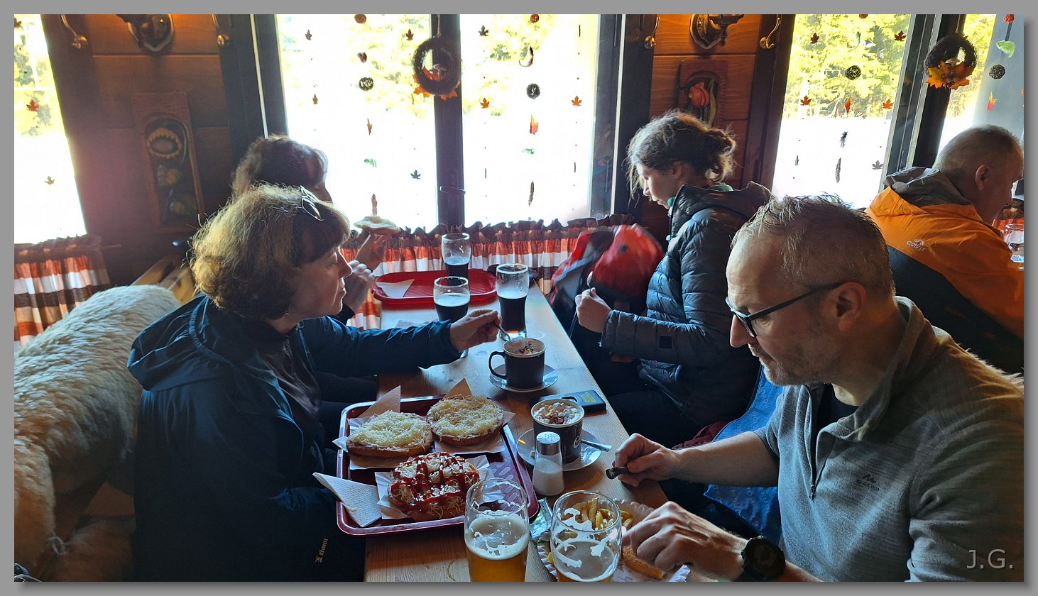 Po 1,5 godz. dochodzimy do czeskiego schroniska. Piotr raczy się serem, a reszta langoszami. Do tego piwo, kofola i czekolada na gorąco. |