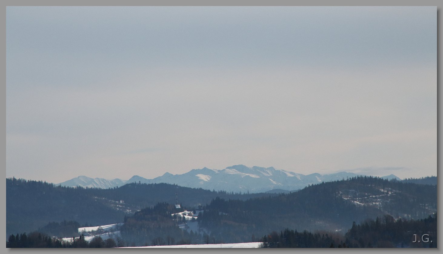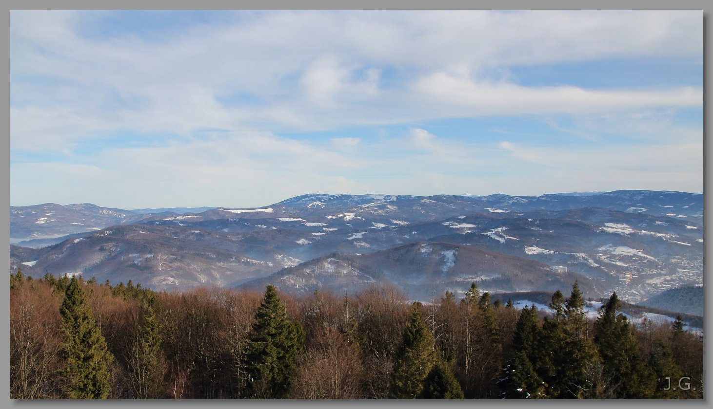 I jeszcze raz Beskid Śląsko-Morawski z najwyższą Lysą Horą (z wieżą). Plan bliżej po prawej Javorovy. |