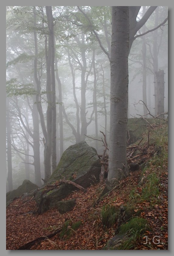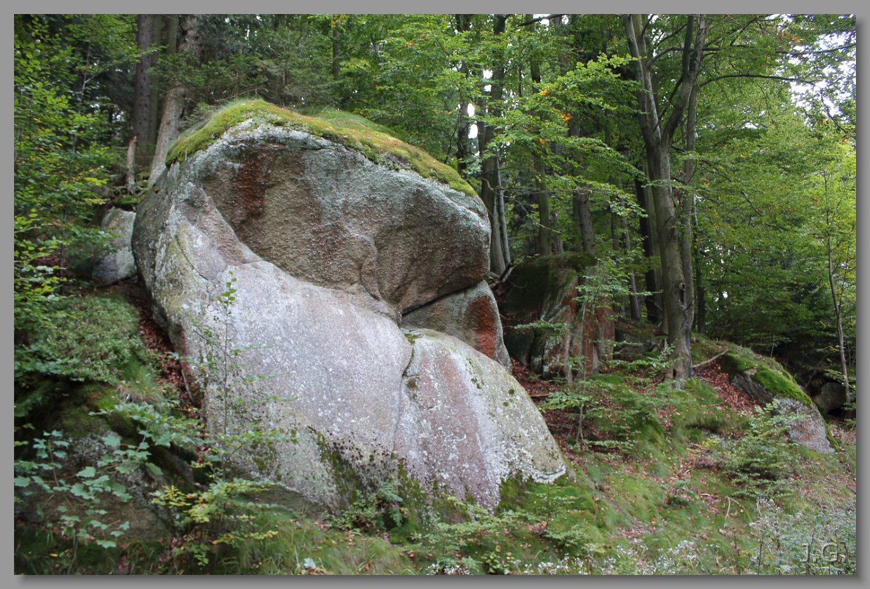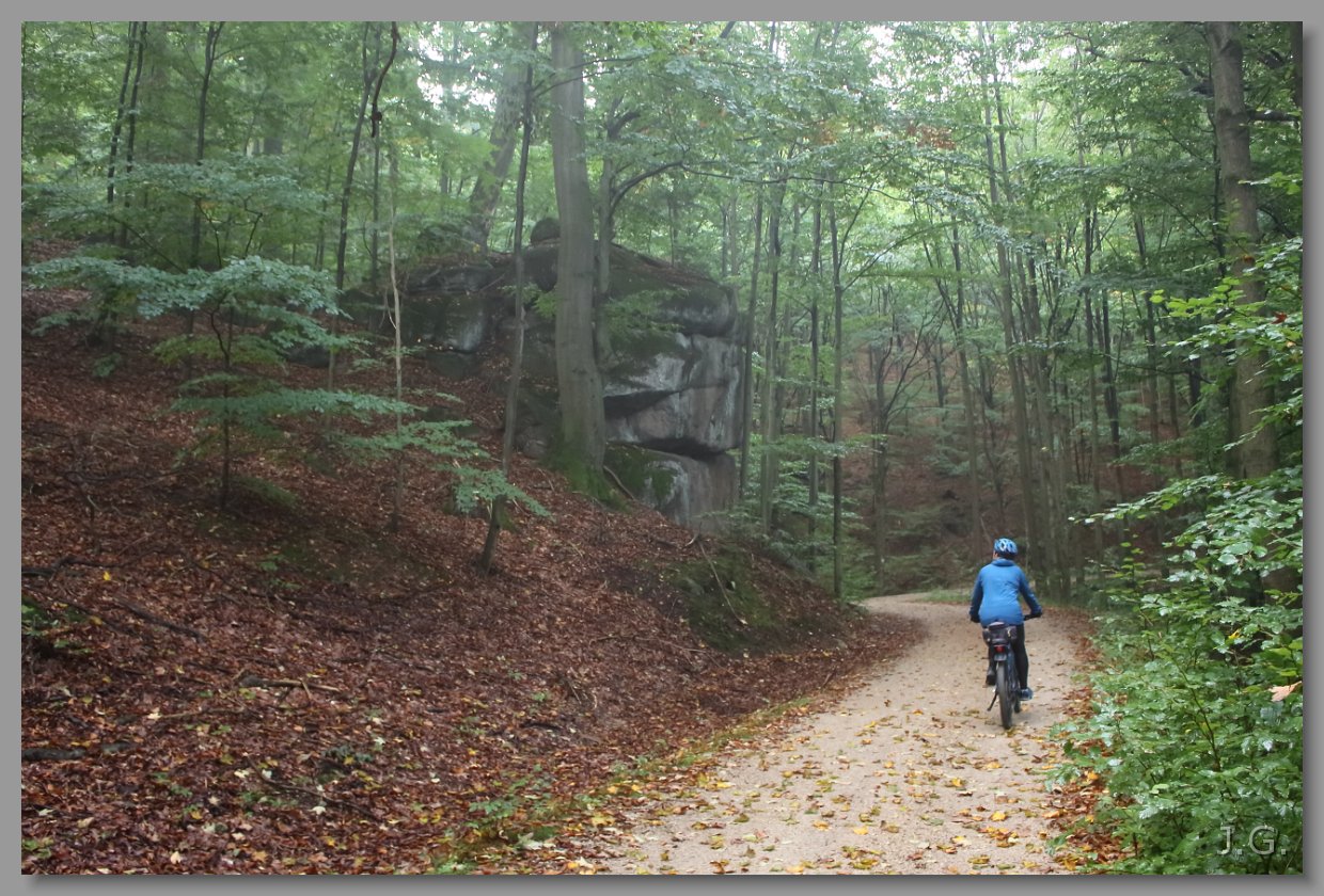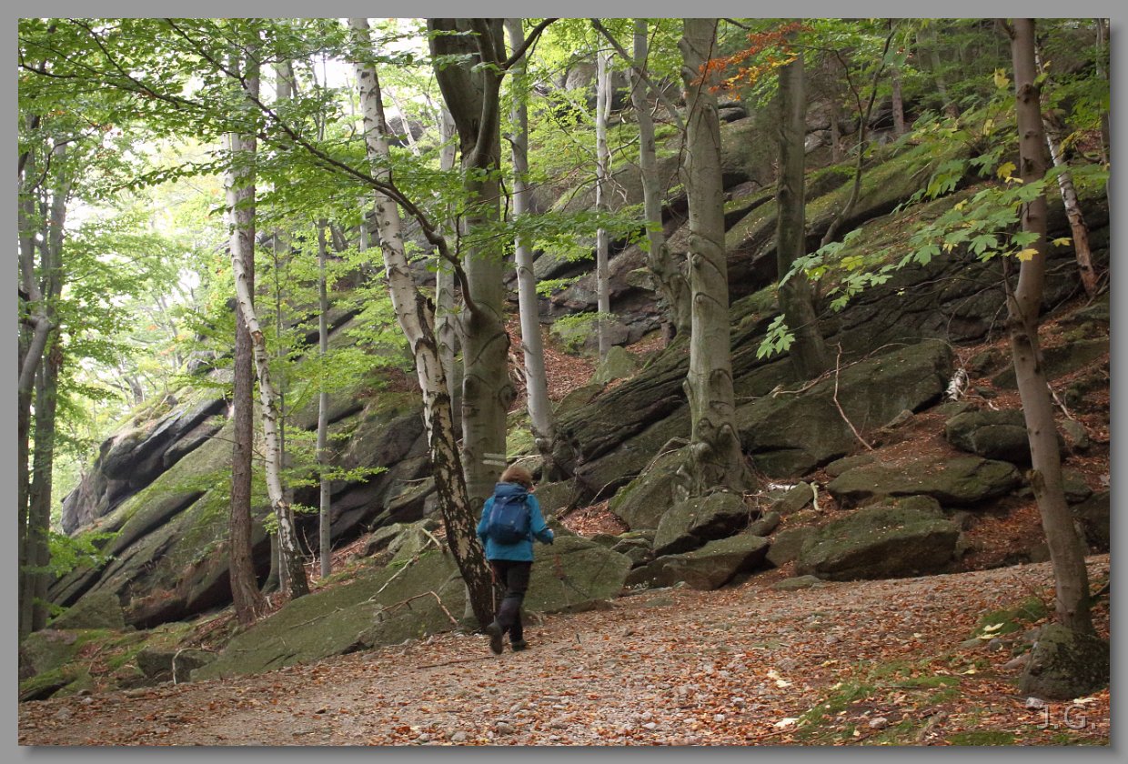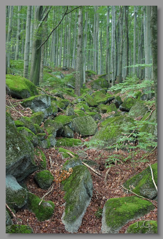 I znów mijamy skały i głazy rozrzucone w bukowym lesie. |