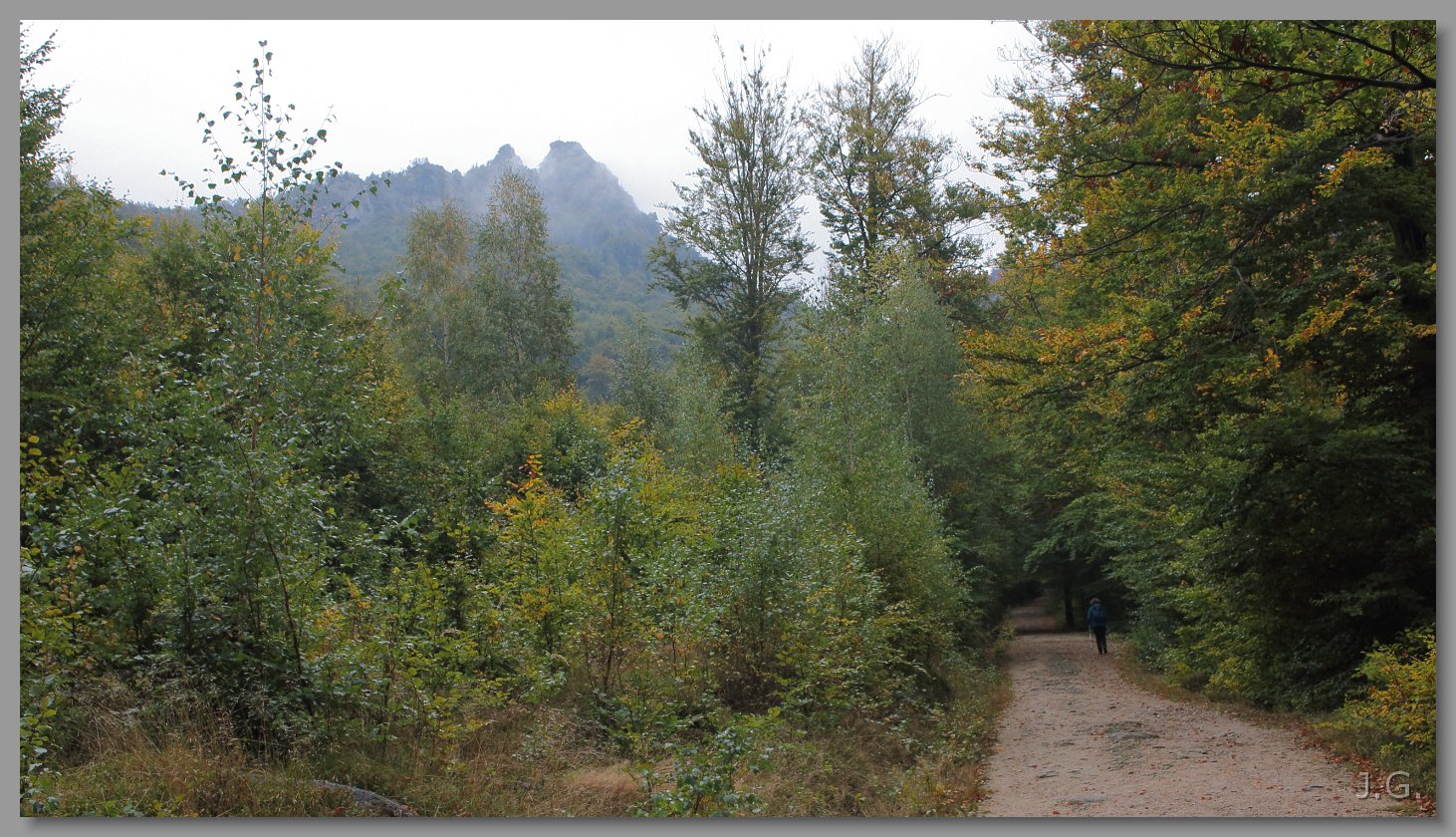 Miały być rowery, ale kiepska pogoda powoduje, że idziemy na pieszą wycieczkę. Ze szlaku ukazuje się widok na skałki Frýdlantské cimbuří. |