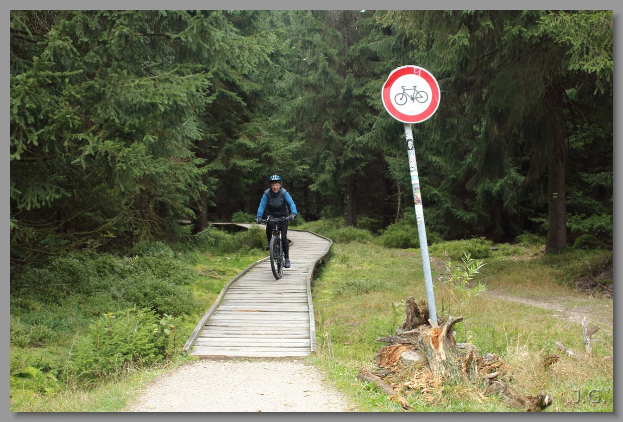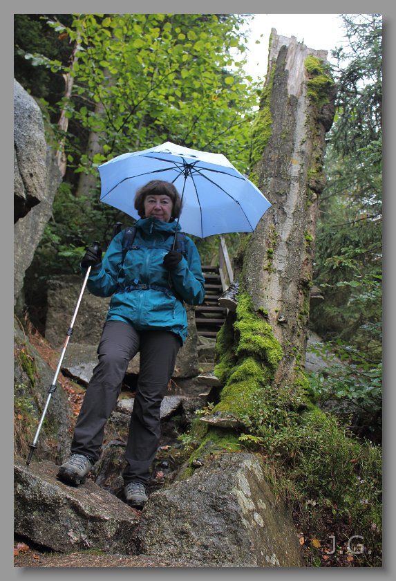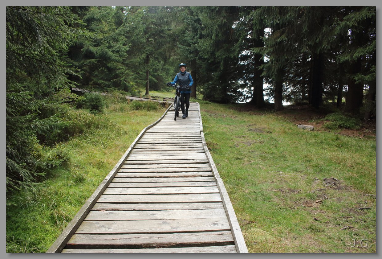 Zaczęło padać, więc nie odbijamy na punkty widokowe na Frýdlantské cimbuří i dochodzimy na polanę z wiatą i jeziorkiem Černý potok. Uwaga - spory odcinek zielonego szlaku jest zupełnie nierowerowy (na zdjęciach tego nie widać). |