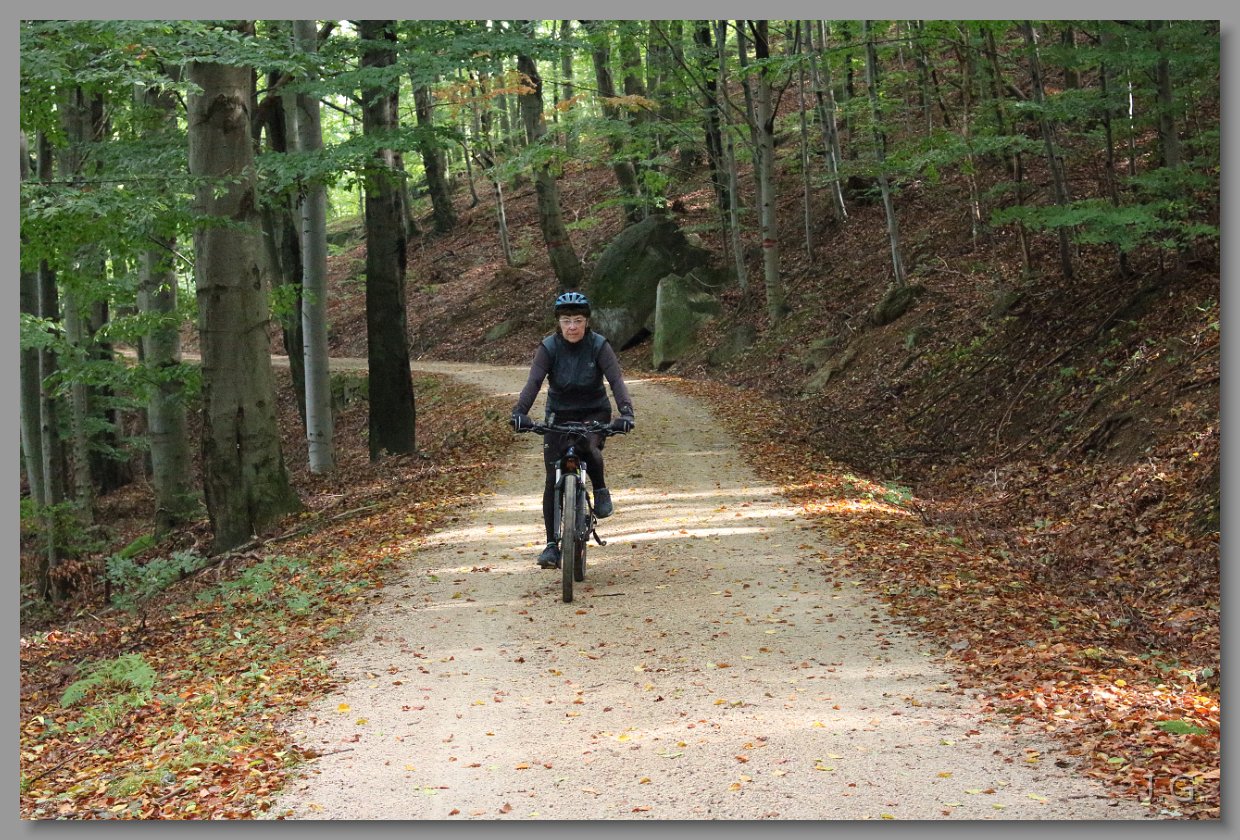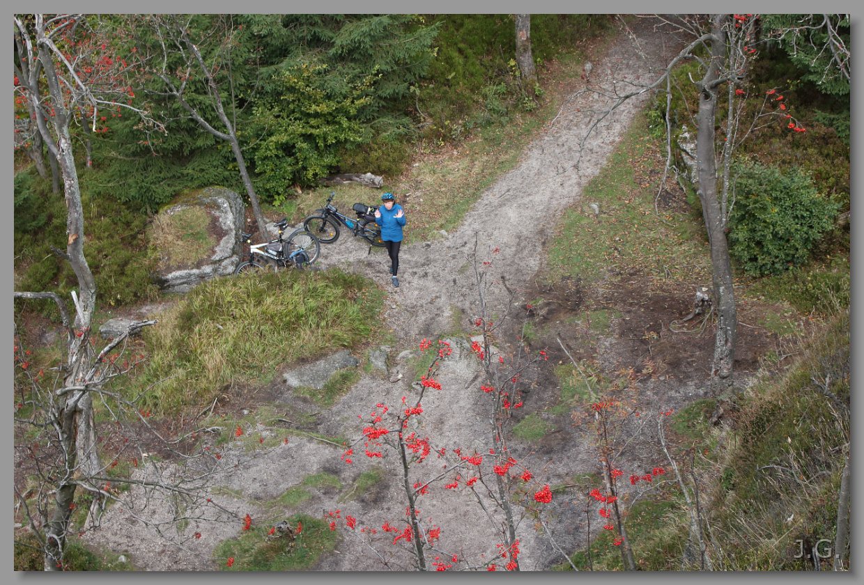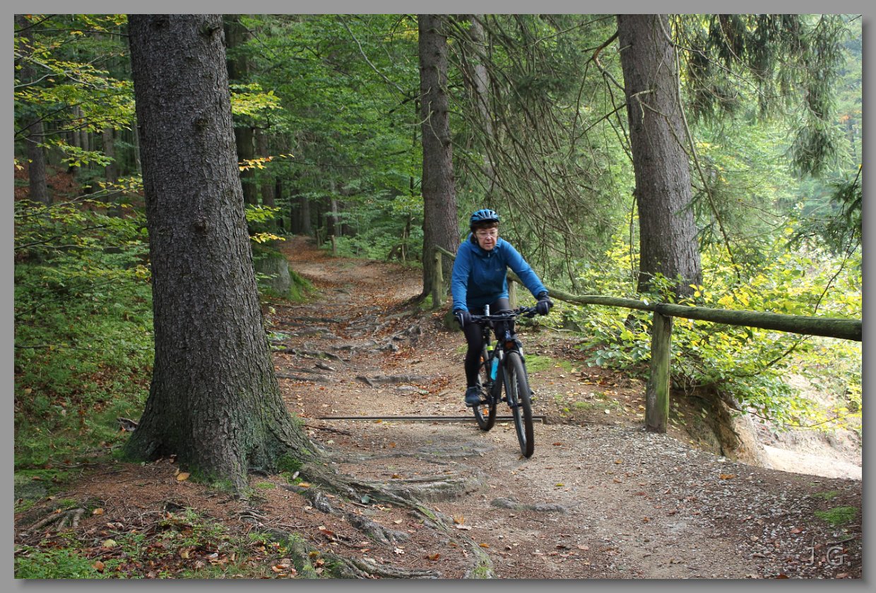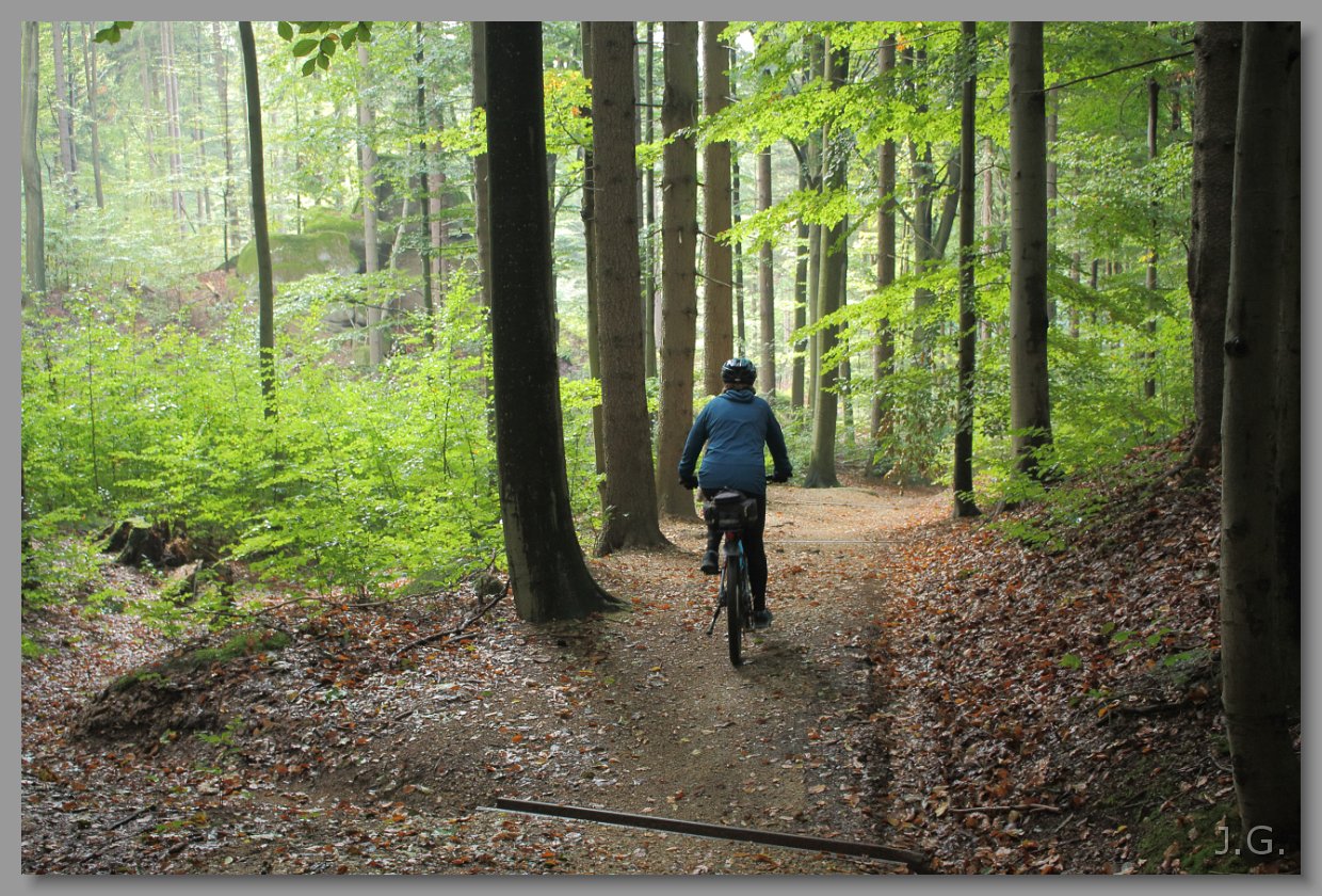 Z Hřebínka zjeżdżamy zielonym szlakiem pieszym. Miejscami jest dość stromo i kamieniście, ale jest to jedyna możliwość zjazdu do Hejnic. Natomiast podjazd tym szlakiem byłby ciężki. |