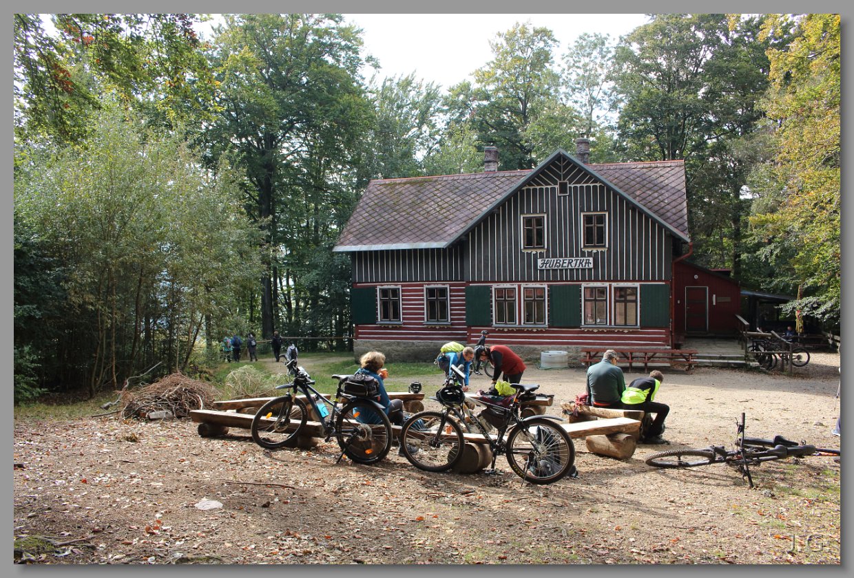 Najpierw mozolnym podjazdem drogą, a końcówkę czarnym singlem docieramy na Hubertkę, gdzie zatrzymujemy się na kawę. Przecina się tu kilka singletracków i szlaków pieszych i jest sporo rowerzystów. |