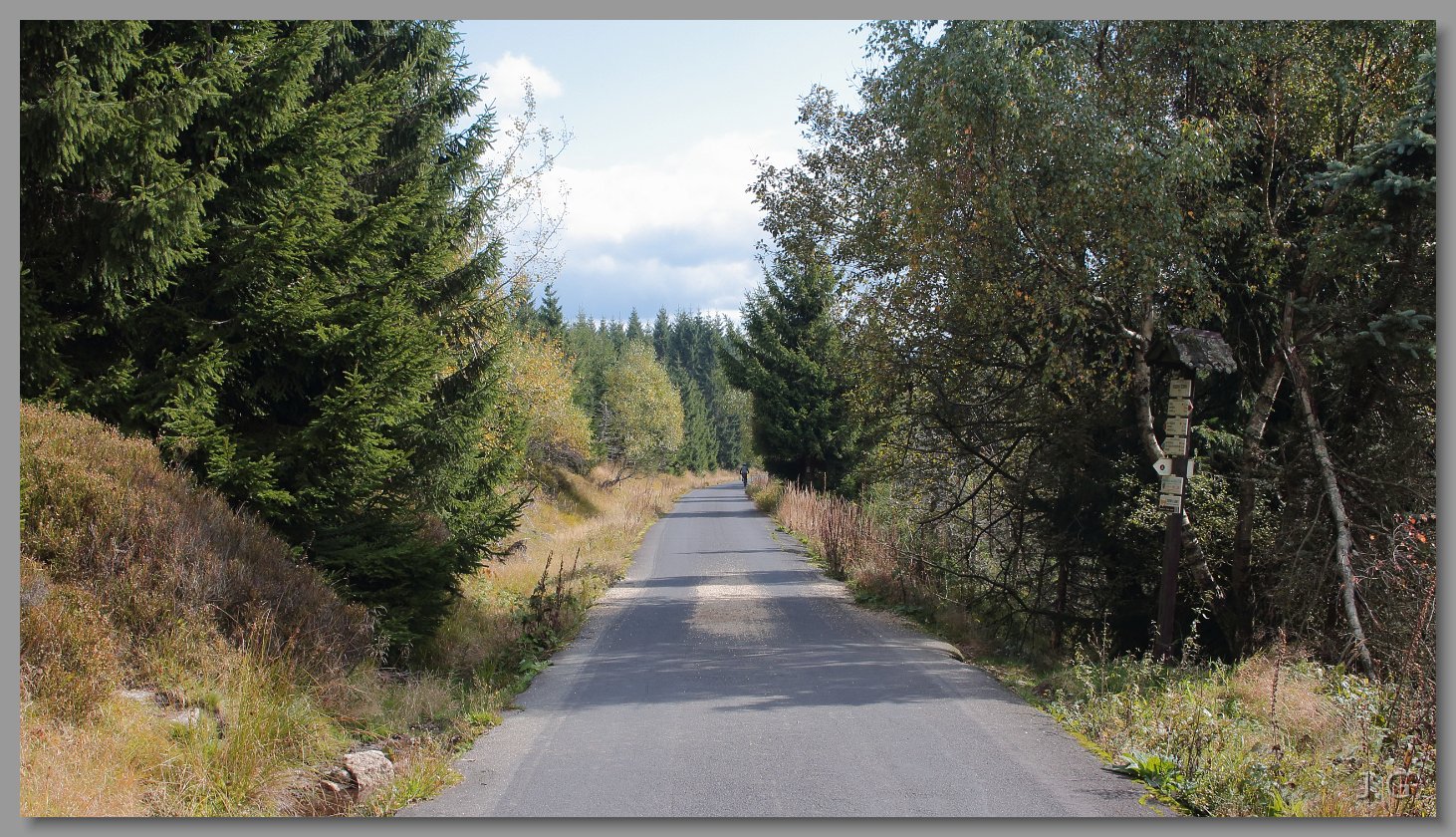 Teraz czerwony szlak prowadzi drogą trawersującą Smrk. Po prawej drogowskazy m.in. ze szlakiem niebieskim (ale niezbyt rowerowym) na szczyt Smrku. |