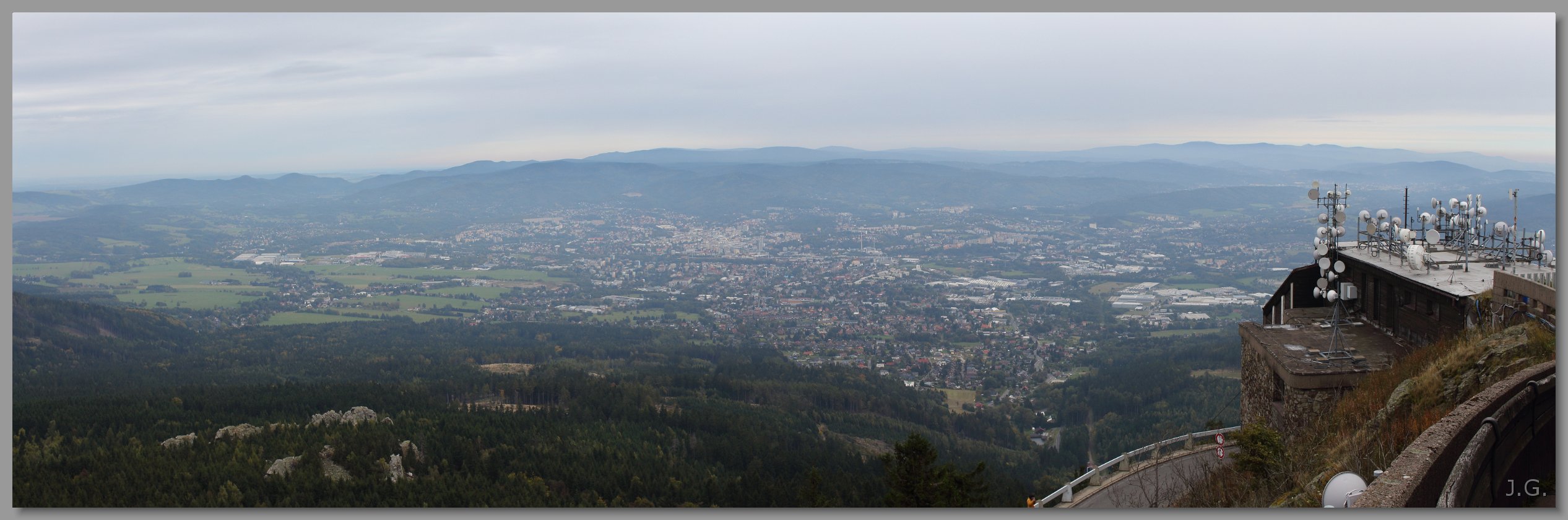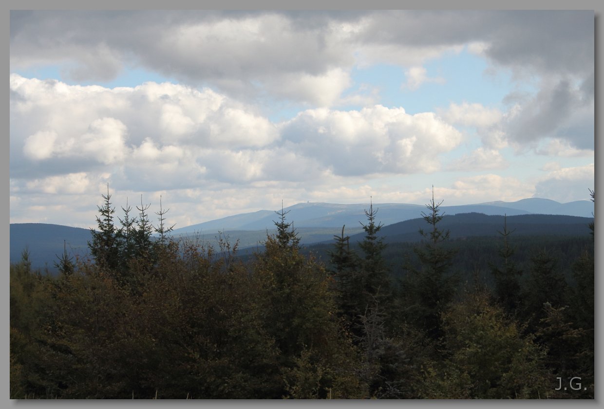 Jeszcze dalej ukazują się Karkonosze z nadajnikiem telewizyjno-radiowym nad Śnieżnymi Kotłami. |