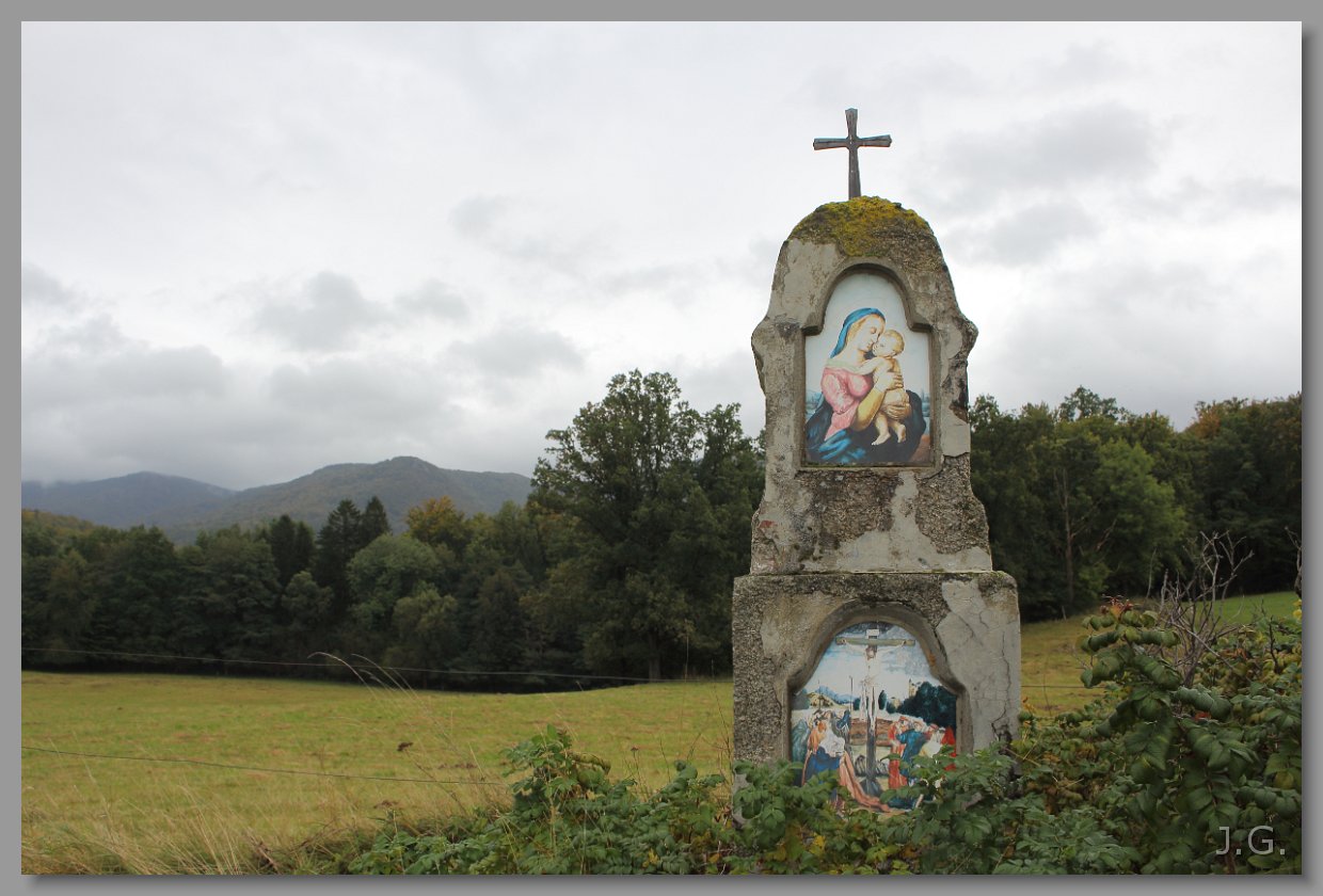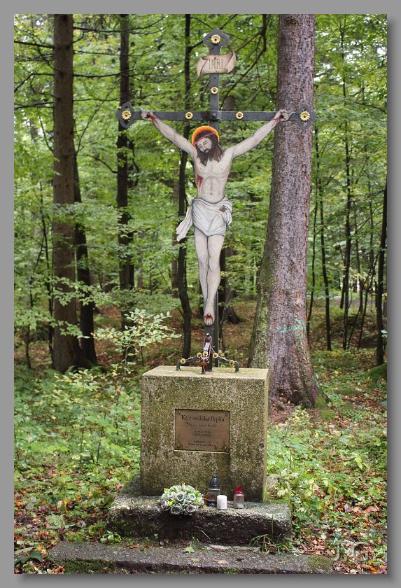Krzyż przy leśnym odcinku szlaku 3065. |