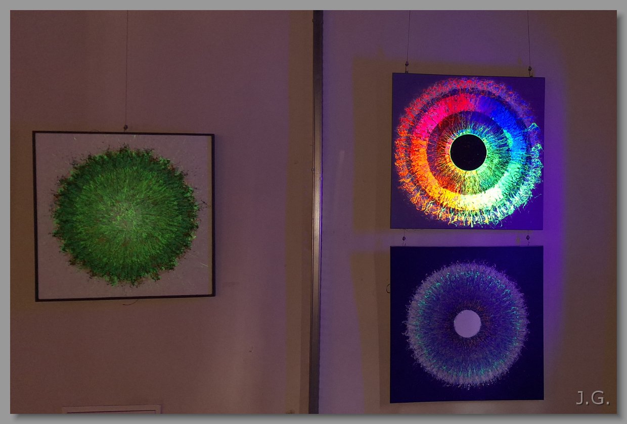 Obrazy Picza mają jakby dwie warstwy - jedną widzianą w świetle dziennym, drugą, fluorescencyjną w ciemności. |