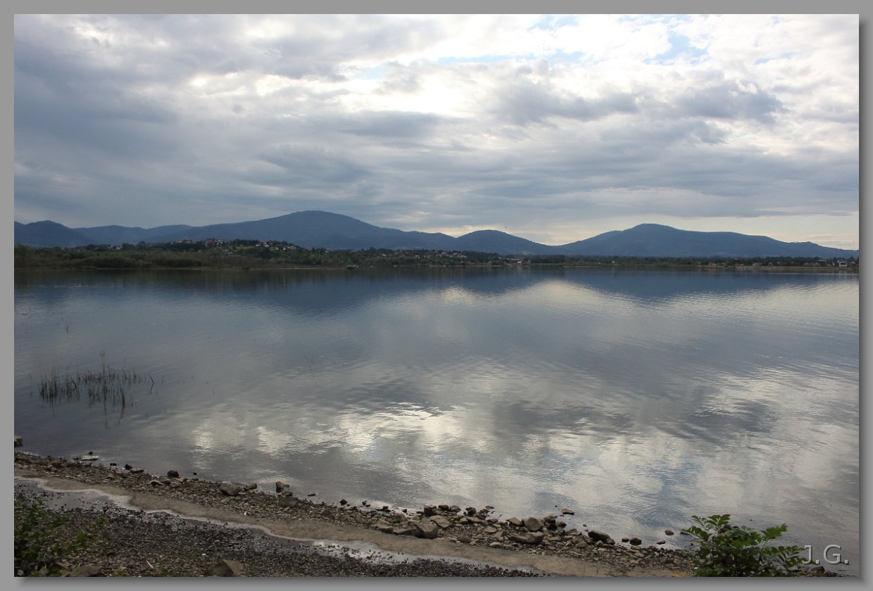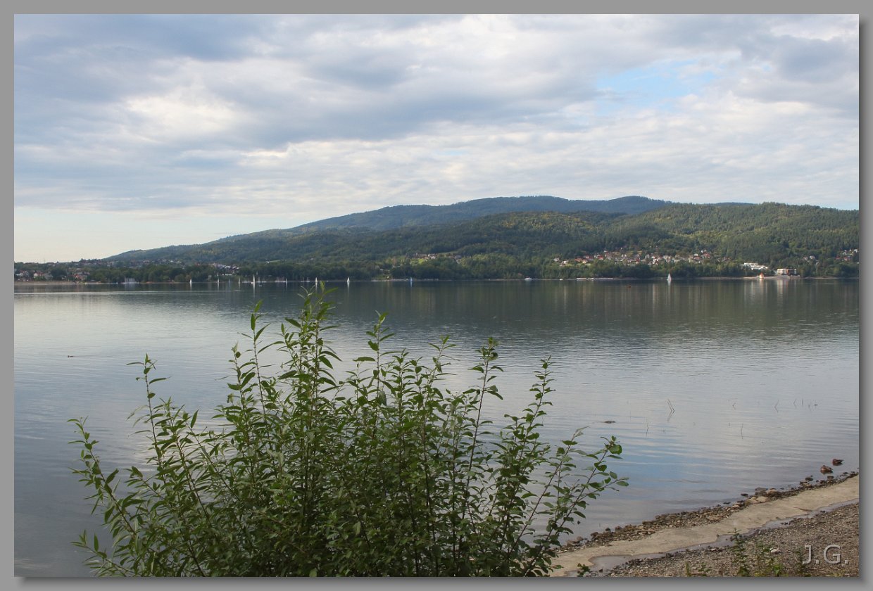 Po obiedzie kontynuujemy wycieczkę, aby zaliczyć całe Velo Soła. Za Jeziorem widać Skrzyczne i Klimczok z Magurą. |