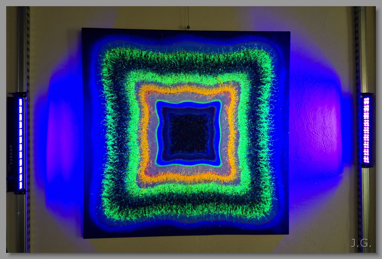 Obrazy Picza mają jakby dwie warstwy - jedną widzianą w świetle dziennym, drugą, fluorescencyjną w ciemności. |
