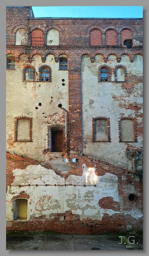 Wyglądając przez okno galerii zauważam ścianę jednego z budynków starego browaru o ciekawej fakturze, która też mogłaby stanowić temat obrazu. |
