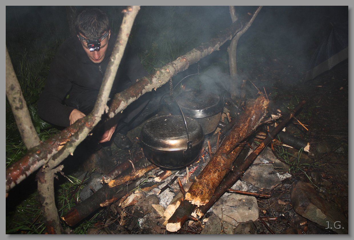 Jest już ogień oraz pierwszy kociołek z pieczonkami. |