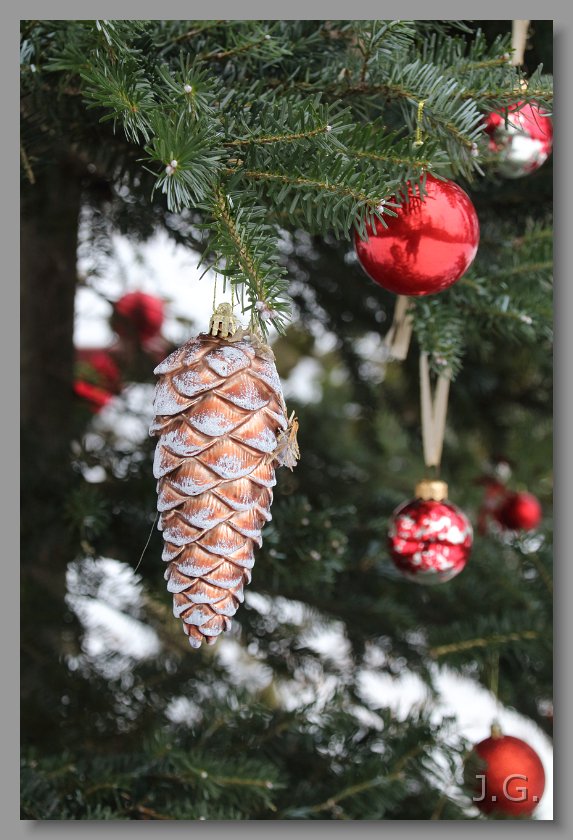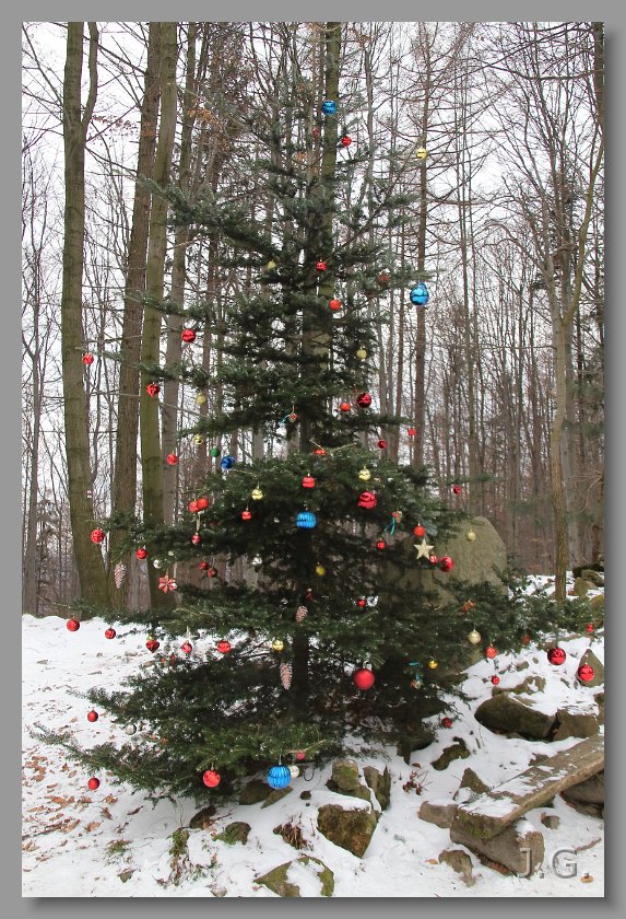 Obok kapliczki stoi przystrojona choinka. |